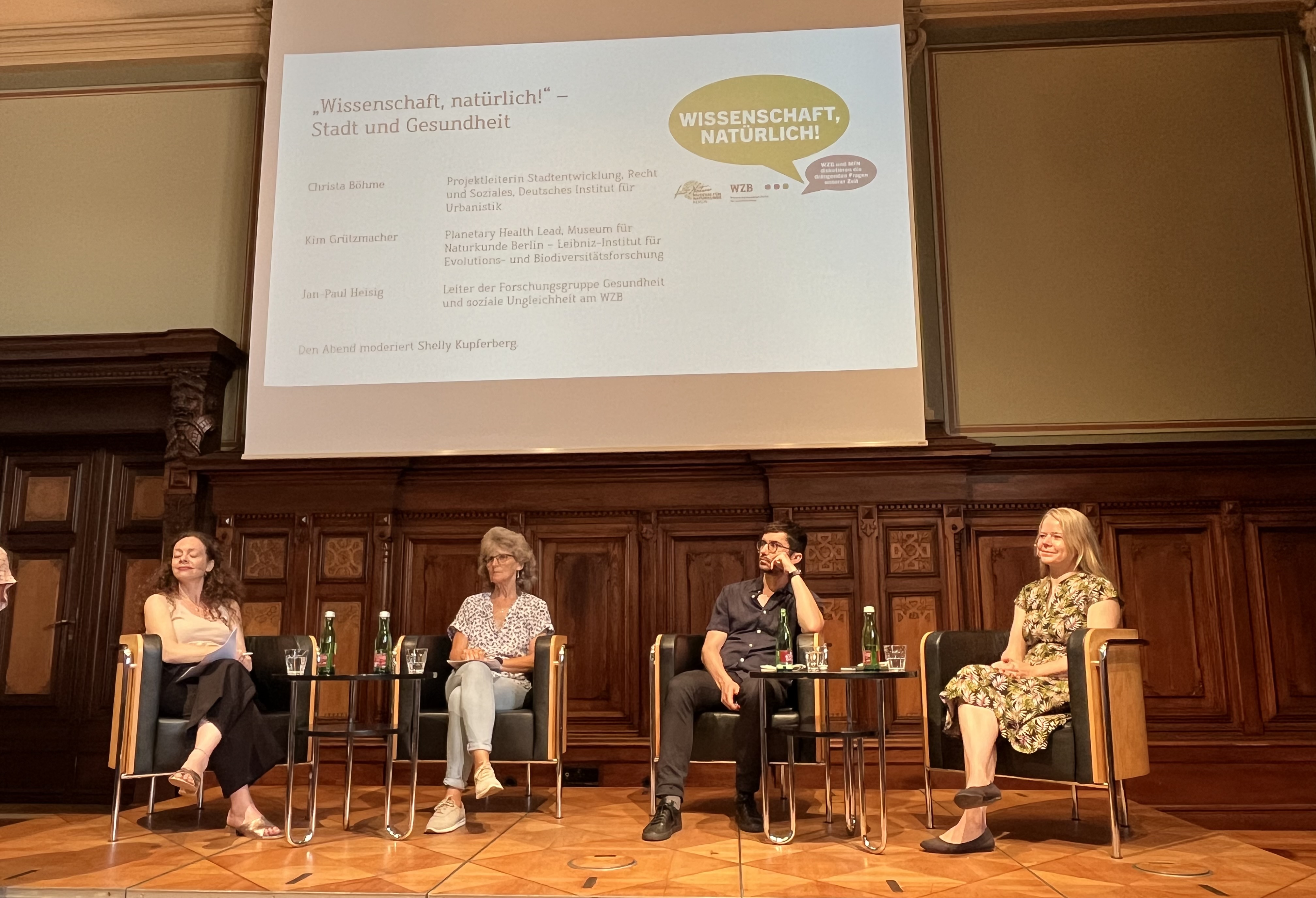 Diese Fragen wurden bei der Veranstaltung der Reihe "Wissenschaft, natürlich!" am 10. Juli 2023 im Wissenschaftszentrums Berlin für Sozialforschung (WZB) in den Blick genommen. Die Transformation der städtischen Lebensbedingungen wurde an diesem Abend mit der Klimakrise verknüpft . Denn Planetary Health, der Zustand der Erde und das Wohlergehen der Menschen, müssen zusammen gedacht werden. Auch stadtplanerische Aspekte werden in unserer Diskussion eine große Rolle spielen. Wie kann eine gesundheitsfördernde und integrierte Stadtentwicklung aussehen? Und schließlich wollen wir in die Zukunft blicken. Die Stadt von morgen: Wie soll sie aussehen, wie werden wir wohnen, wie werden wir uns fortbewegen? Wie lassen sich Natur und Stadt zusammenbringen? Und das Wichtigste: Wie schaffen wir Raum für unsere Kinder?